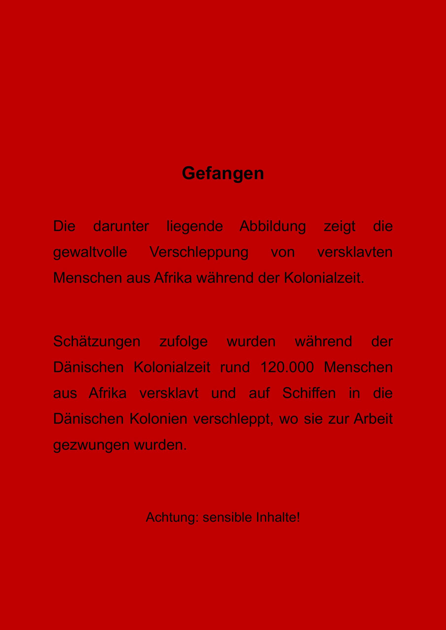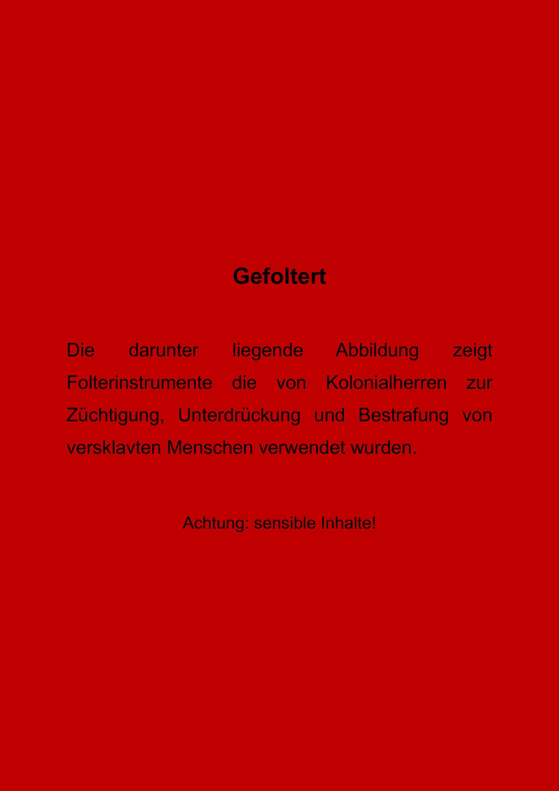 Den Zucker, mit dem Flensburger Kaufleute reich wurden, haben auf den drei von Dänemark kolonisierten Inseln St. Croix, St. Thomas und St. John verschleppte und versklavte Afrikanerinnen und Afrikaner angebaut. Während des Transports über den Atlantik und auf den Plantagen erlebten versklavte Menschen extreme Gewalt. Während der zwei- bis dreimonatigen Überfahrt waren versklavte Menschen auf engstem Raum im Rumpf der Schiffe gefangen und der Gewalt der Menschenhändler ausgeliefert. Viele überlebten die Überfahrt nicht. Andere widersetzten sich durch Selbsttötung, Hungerstreik oder Meutereien. Auf den Zuckerrohrplantagen wurden versklavte Menschen durch schlechte Ernährung und mangelnde Hygiene, Überarbeitung, Unfälle oder durch die direkte Gewalt der Aufseher umgebracht. Da viele der zur Arbeit gezwungenen Menschen früh starben und wenige Kinder geboren wurden, war dieses System auf die immer neue Verschleppung von Menschen angewiesen. Auch auf den Plantagen widersetzten sich die Versklavten auf vielfache Weisen. Die Folterinstrumente, die zur Strafe eingesetzt wurden, sind also nicht nur ein Zeichen der Gewalt, sondern auch ein Beleg des alltäglichen Widerstands.