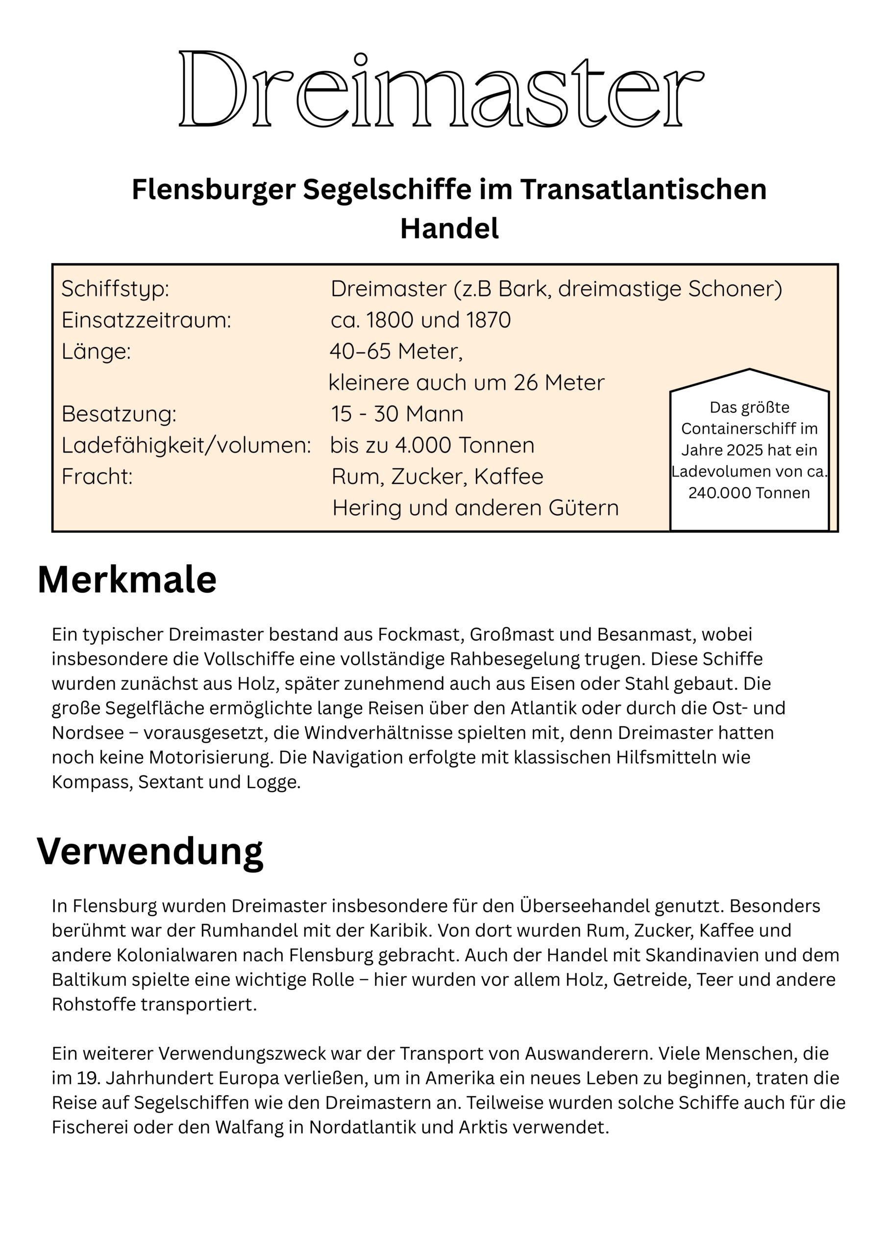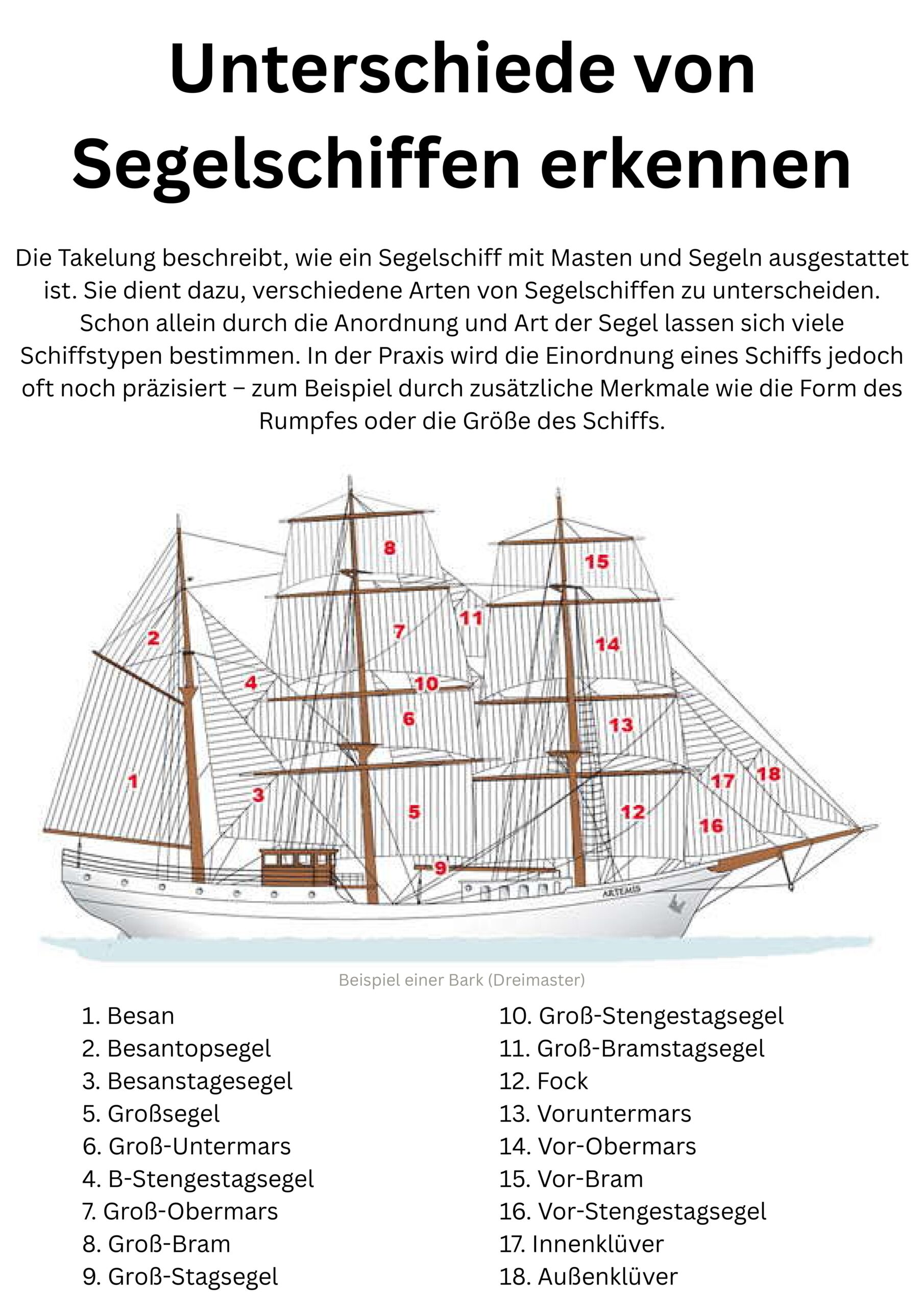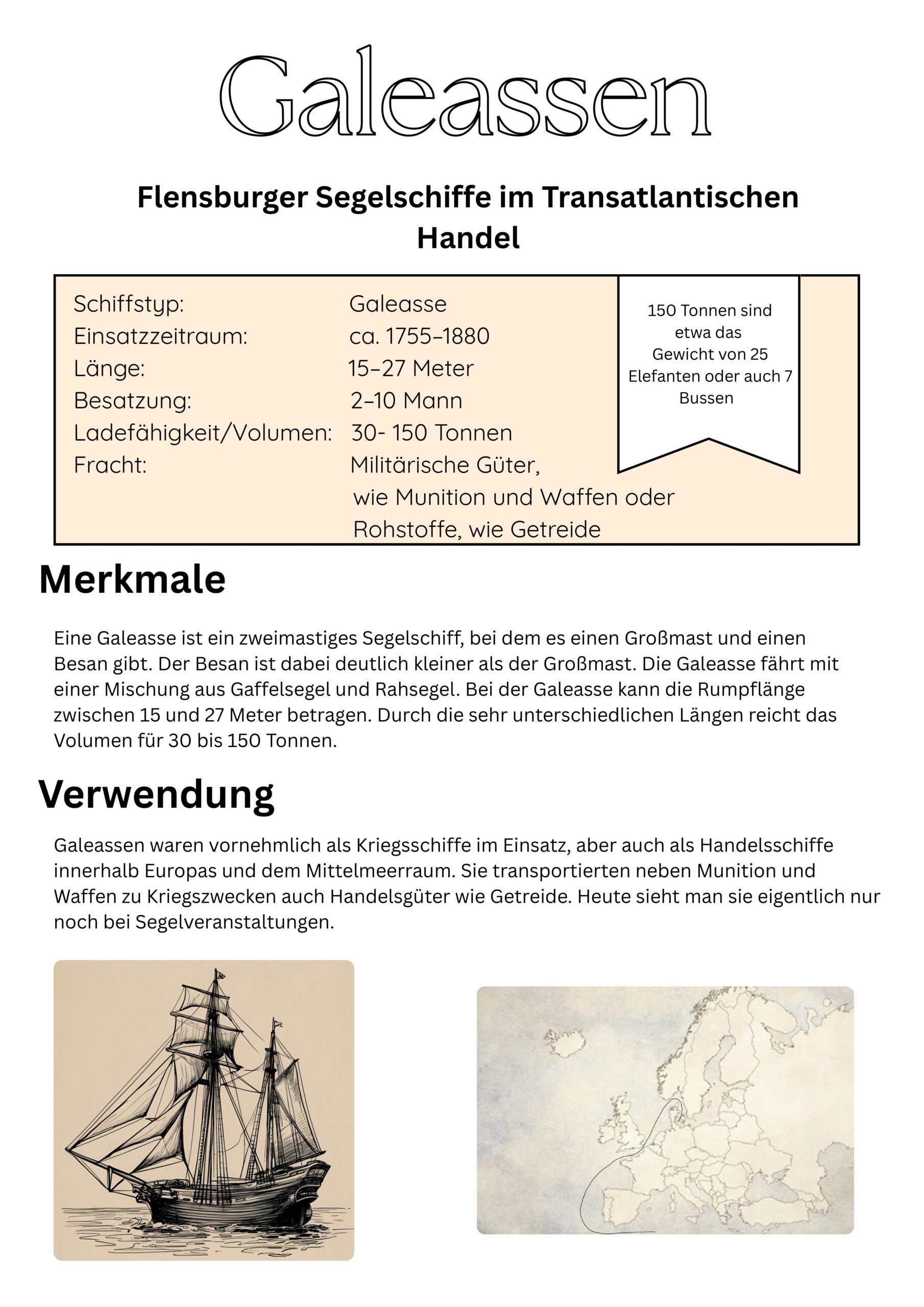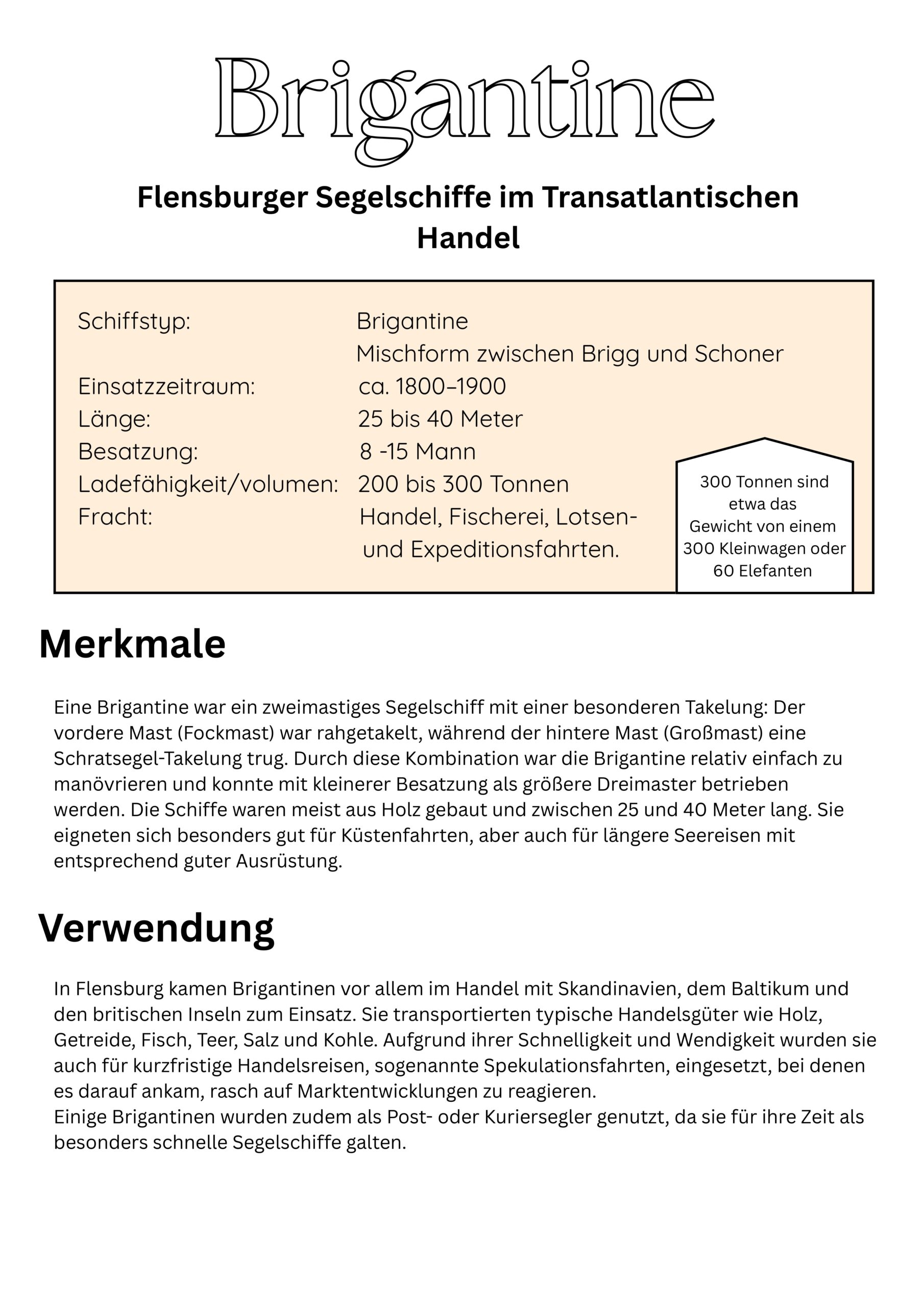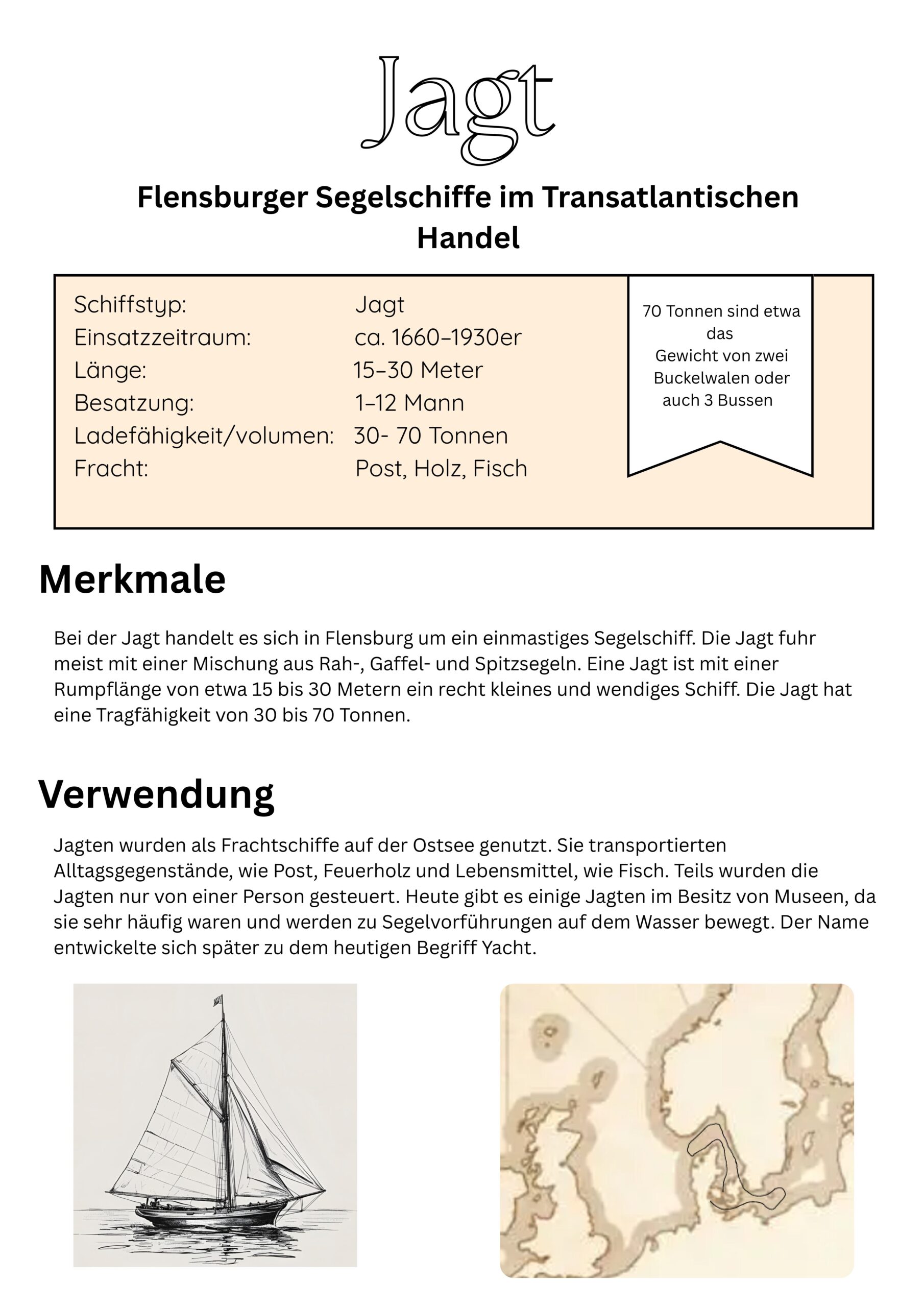 Das Vermittlungsprojet „Maritime Geschichte“ fasst die Funktionen, Routen und transportierten Waren der verschiedenen Schiffstypen systematisch zusammen. Ergänzende Informationstafeln beschreiben für die Schiffstypen Brigg, Brigantine, Galeasse, Jagt und Dreimaster die Merkmale und Verwendung dieser Schiffe, ihre Routen und ihre übliche Fracht.