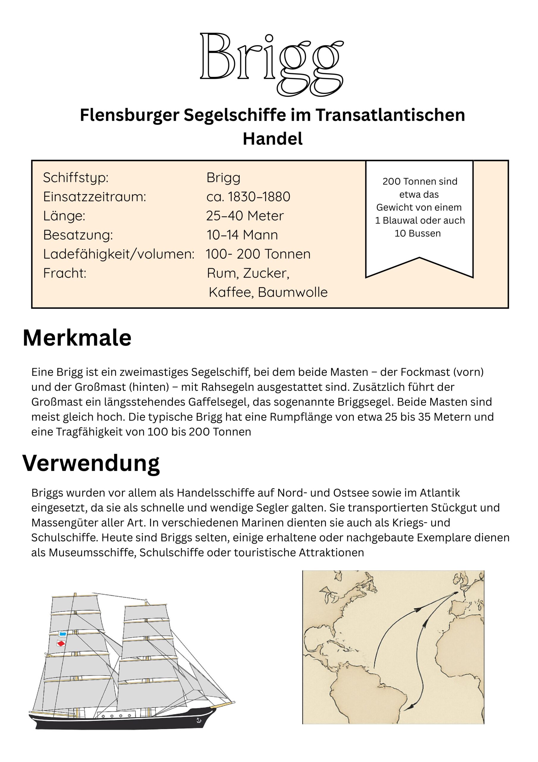 Das Flensburger Schifffahrtsmuseum zeigt einige Schiffsmodelle und -typen, die im globalen Handel von Flensburger Reedern und Kaufleuten eingesetzt wurden. In Folge zunehmender geographischer und politischer Verflechtung des globalen Handels und der intensivierten Kolonisierung mit der Plantagenökonomie und dem transatlantischen Versklavungshandel wurden neue Schiffstypen entwickelt. Koloniale Ressourcenströme wie der von Zucker aus der Karibik, Gewürzen aus Südostasien oder Silber aus Südamerika, aber auch der Raub von Kulturgütern aus den Kolonien waren eng verbunden mit der Verfügbarkeit und Leistungsfähigkeit verschiedener Schiffstypen. Briggs und Schoner beispielsweise wurden für Küstenhandel und kurze transatlantische Routen eingesetzt, Fregatten für den Versklavungshandel zwischen Westafrika und der Karibik.