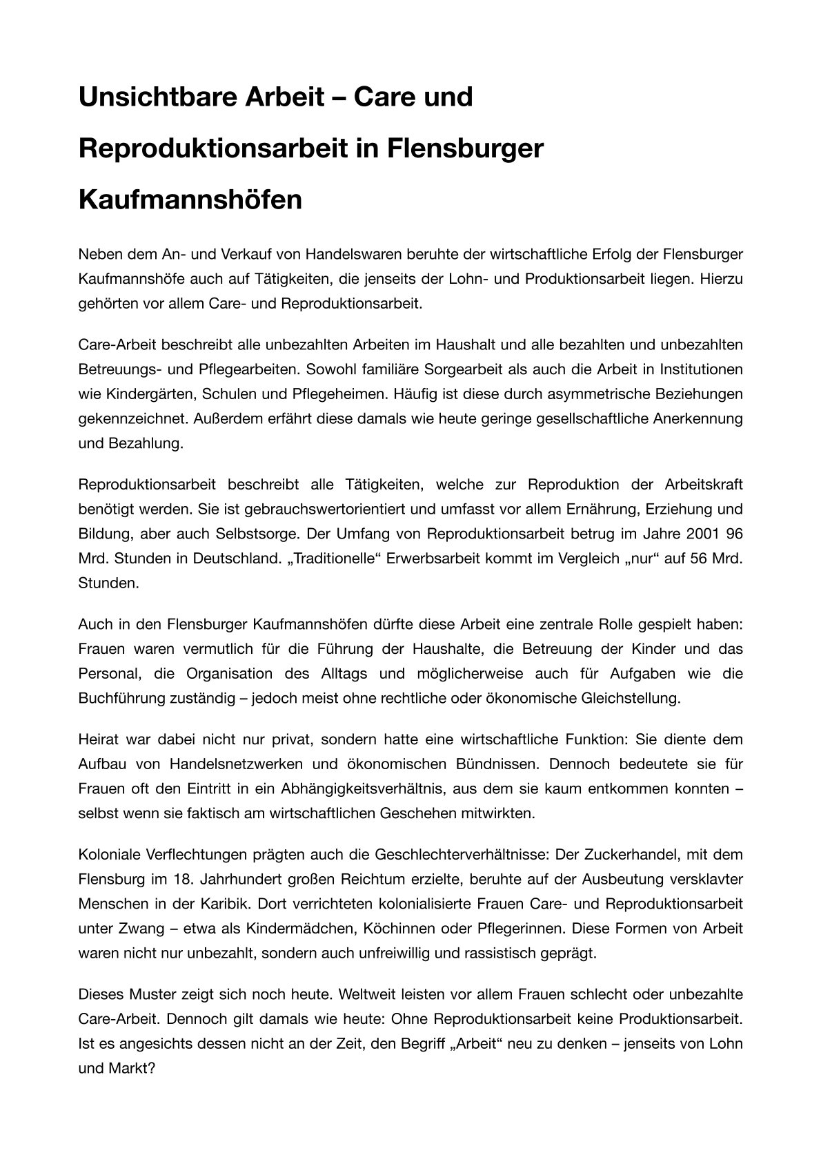 Des Vermittlungsprojekt ergänzt am Modell des Flensburger Kaufmannshofs eine Infotafel und eine Audiostation zu unbezahlter Sorge- und Reproduktionsarbeit. Insgesamt sensibilisiert diese ergänzende Objektinformation dafür, dass ökonomische Prozesse immer mit geschlechtlichen Machtverhältnissen verwoben sind. Das ist bis heute noch der Fall, da Frauen weiterhin einen Großteil der unbezahlten (oder schlecht bezahlten) Sorge- und Reproduktionsarbeit leisten.