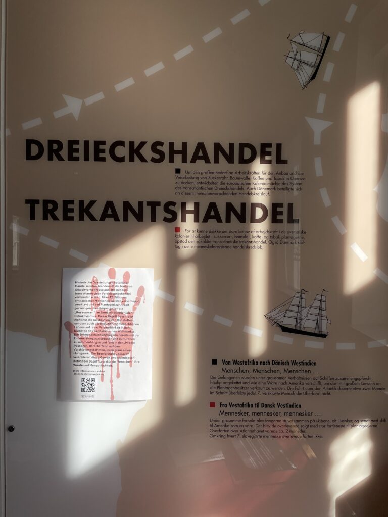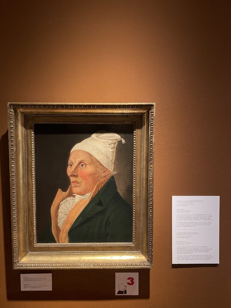 Die Ausstellung zeigt ein historisches Portraitgemälde von Andreas Christiansens mit der Beschreibung „ein fleißiger Kaufmann mit Weitblick“. Die Bildkontextualisierung ist ein Beispiel epistemischer Gewalt. Dieser Begriff kennzeichnet eine Gewaltform, die durch die Dominanz bestimmter Perspektiven im Hinblick auf Wissen, Sprache und Macht wirksam wird. Die Beschreibung Christiansens verschweigt die kolonialen Gewaltverhältnisse, in denen sein ökonomischer Erfolg begründet lag, und reproduziert damit ein Wissenssystem, das koloniale Ausbeutung nicht nur dethematisiert, sondern sogar normalisiert und aktiv ästhetisch in Szene setzt. Porträts wie das von Christiansen waren Luxusobjekte, die der Inszenierung von sozialem Status und ökonomischer Macht dienten. Dass ein Kaufmann sich auf diese Weise darstellen ließ, verweist auf eine Selbstverortung in einem System, das koloniale Ausbeutung nicht als Gewalt, sondern als unternehmerische Leistung rahmte.
