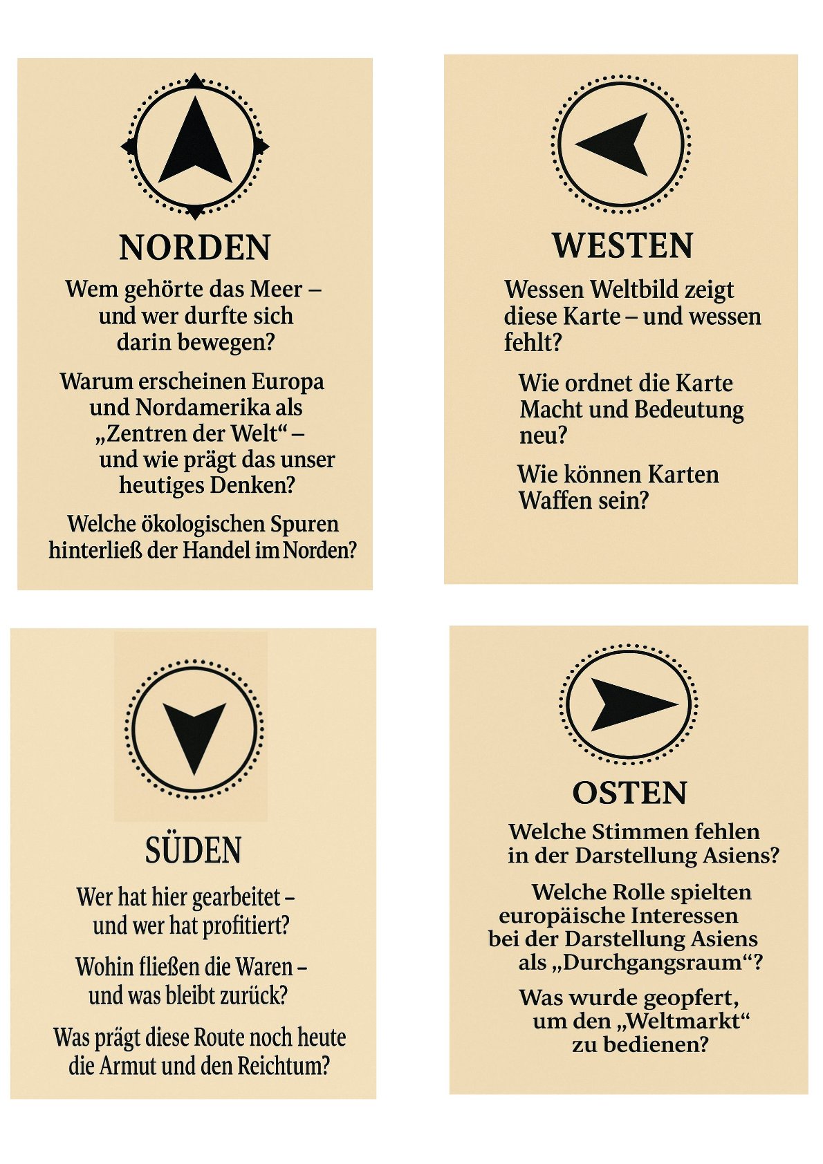 Mit einem ergänzten Kompass werden kritische Fragen zu Kolonialismus, Ressourcenströmen, Macht und Gerechtigkeit angeregt. Wer in Handelsstrukturen und globalen Märkten profitiert und wer die Lasten trägt, ist oft ungleich verteilt. Beispielsweise werden zahlreiche Produkte und Rohstoffe, die im Globalen Norden konsumiert werden, im Globalen Süden unter gesundheitsgefährdenden Bedingungen abgebaut, hergestellt oder entsorgt. Ähnlich ungerecht organisiert sind globale Lieferketten. Diese hierarchischen Verhältnisse werden im Rahmen internationaler Vereinbarungen durchgesetzt, die systematisch Stimmen von Beteiligten dieser Ressourcenströme ausschließen. Letztlich sind es diese Machtverhältnisse, die auf Karten abgebildet und damit verstärkt werden.