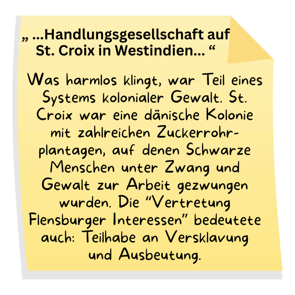 Neben dem Handel mit und der Verarbeitung von kolonialen Waren wie Zucker und Rum beruht der wirtschaftliche Erfolg und die Kontinuität der Flensburger Kaufmänner und ihrer Familiendynastien auch auf der unbezahlten Sorge- und Reproduktionsarbeit von (Ehe-)Frauen. Sogenannte nicht-produktive Tätigkeiten haben in diesem Kaufmannshof die Produktionsprozesse und die Produktivität der Rohstoffverarbeitung erst ermöglicht. Dass über die Tätigkeiten der Frauen in den Flensburger Kaufmannshöfen nur sehr wenige Quellen existieren, verdeutlicht, dass diese Arbeit auch in wissenschaftlichen Untersuchungen und historischen Dokumenten und Archiven oft als unwichtig angesehen wurde und damit für die Nachwelt unsichtbar gemacht wird.