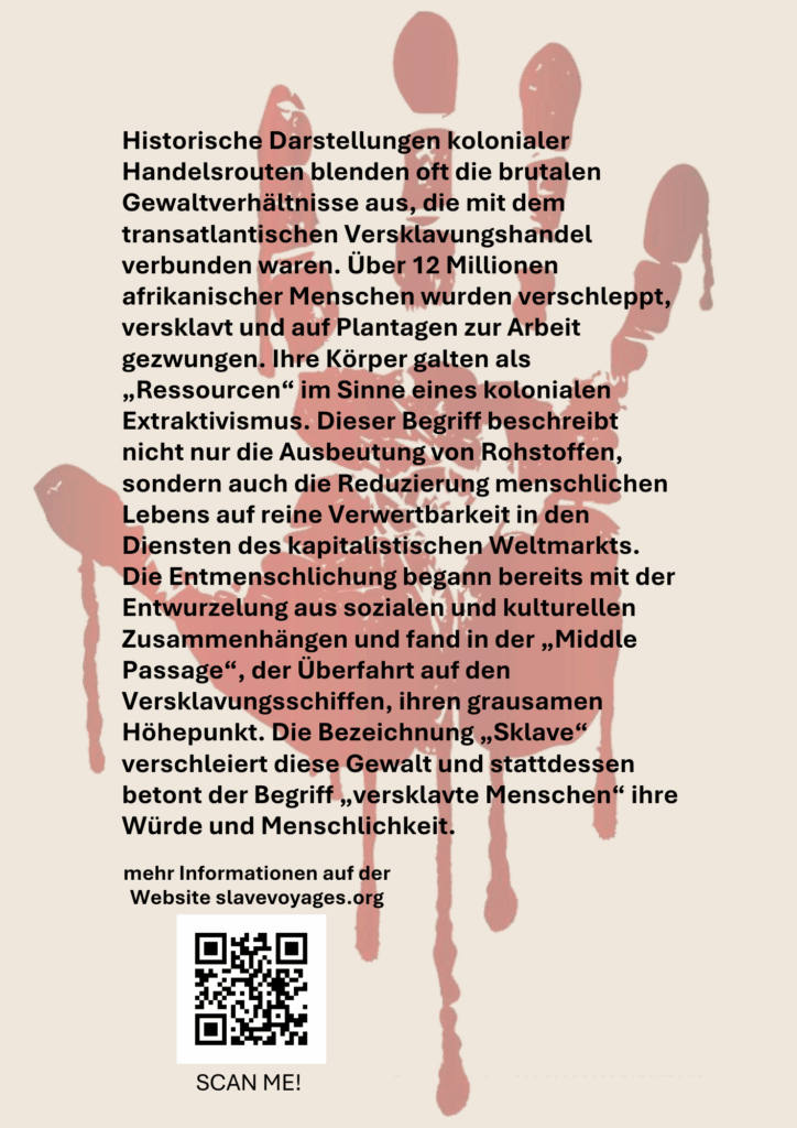 Das Vermittlungsprojekt lenkt die Aufmerksamkeit auf diese entmenschlichende und tödliche Gewalt mit einer ergänzten Infotafel, die eine blutige Hand zeigt. Sie verweist auf die Plattform slavevoyages.org, die eine umfassende Datenbank zum Versklavungshandel und zahlreiche weiterführende Materialien bereitstellt. Die Datenbank der Website zeigt beispielsweise, dass über 5 Millionen Menschen alleine aus Westzentralafrika verschleppt wurden. Zu beachten ist dabei, dass die Beschreibung des Versklavungshandels mit bloßen Zahlen Gefahr läuft, selbst reduzierend und entmenschlichend zu wirken. Wie über den Versklavungshandel gesprochen wird, ist zentral. So suggeriert beispielsweise der Begriff „Sklave“, der Zustand der Versklavung sei ein Wesensmerkmal. Diese Zuschreibung entwurzelt die verschleppten Menschen wiederholt aus ihren sozialen und kulturellen Kontexten. Im Rumpf der Transatlantikschiffe wurden versklavte Menschen von europäischen Menschenhändlern endgültig zur Ware gemacht. Um diesen Prozess nicht zu reproduzieren und die Menschlichkeit und Handlungsmacht der Verschleppten zu bewahren, wird hier der Begriff „versklavte Menschen“ verwendet.